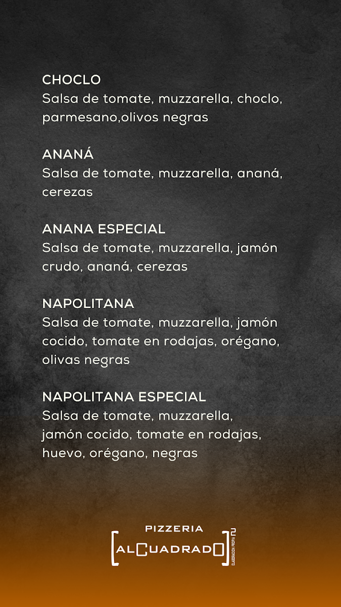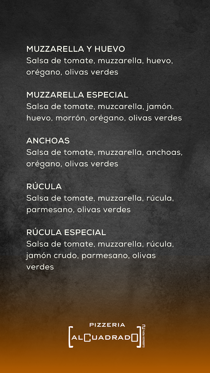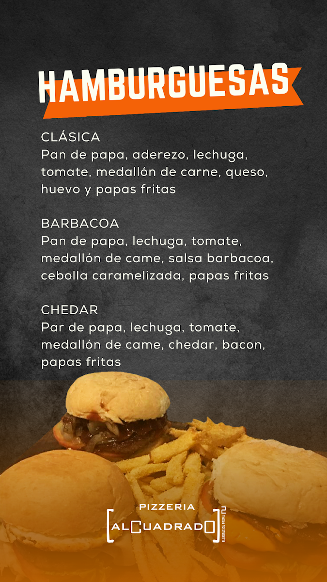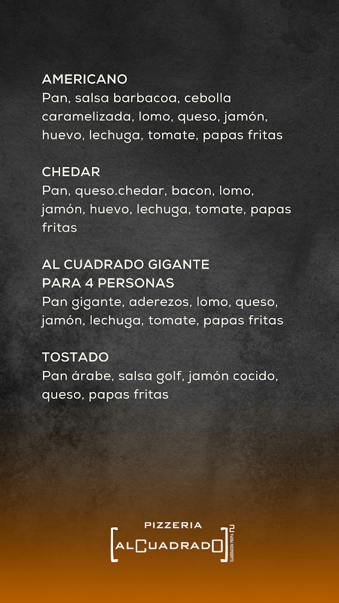 Al Cuadrado Pizzería offers a menu that balances classic comfort foods with hearty Argentine favorites, making it easy for any diner to find something satisfying. Their pizza selection ranges from the simple Muzzarella to the more indulgent Muzzarella Especial, while combinations like Muzzarella y Jamón, Muzzarella y Morrón, and Muzzarella y Huevo add variety for those seeking richer flavors. For burger enthusiasts, options like the Hamburguesa Clásica, Hamburguesa Cheddar, and Hamburguesa American provide familiar yet flavorful choices. The lomos section impresses with generous offerings such as Simple, Completo, Completo con palmitos, and the substantial Al Cuadrado Gigante. Sandwich lovers can enjoy Clásicos de siempre, Vegetarianos, and Premium Deli, while empanadas come in multiple fillings, including Árabes, Criollas, Jamón y queso, Pollo, and Cebolla, queso y morrón. Those looking for lighter options or baked dishes can try their Tartas, with varieties like Jamón y queso, Napolitana, Caprese, Atún, and Verdura. Side dishes are simple but satisfying, with Papas complementing the main courses, while the minutas section features traditional Argentine favorites such as Milanesas, Milanesa Napolitana, Sándwich de milanesa, and both Costeletas de carne and Costeletas de cerdo. Overall, the menu at Al Cuadrado Pizzería showcases a thoughtful mix of pizzas, sandwiches, lomos, and traditional Argentine fare, all reasonably priced and designed to cater to diverse tastes, making it a versatile spot for casual dining in Córdoba.