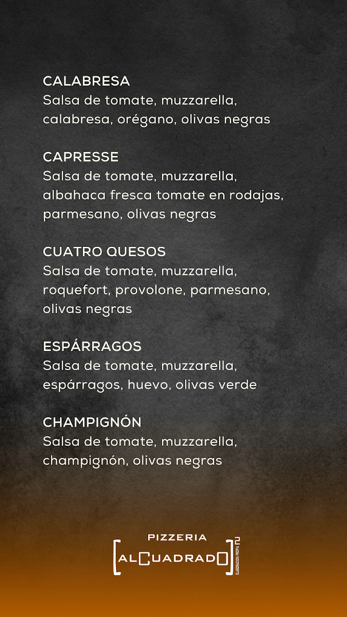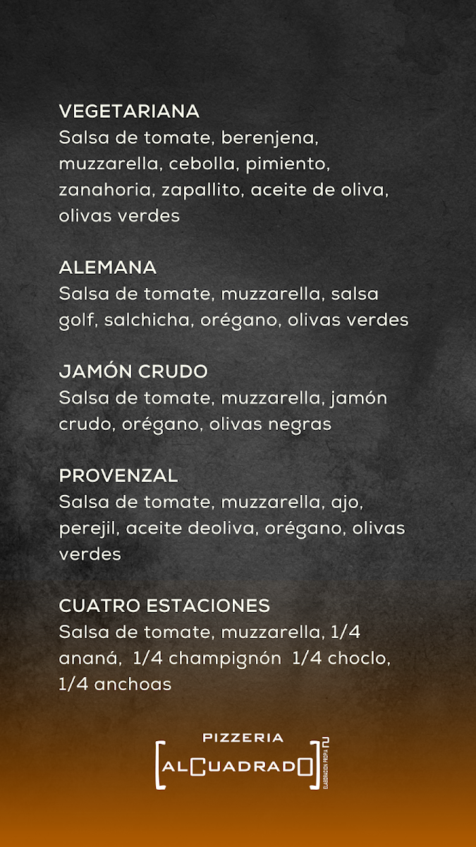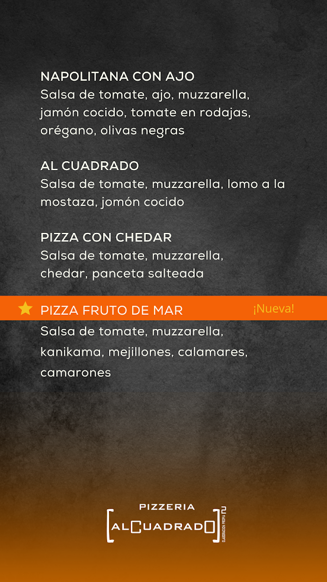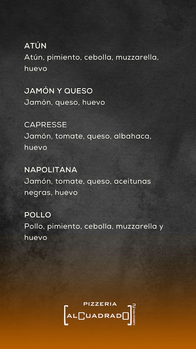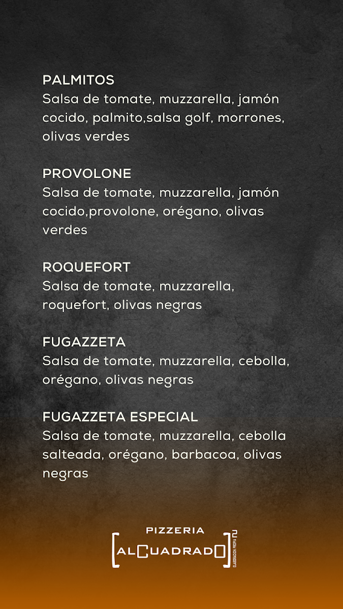 Al Cuadrado Pizzería offers a menu that balances classic comfort foods with hearty Argentine favorites, making it easy for any diner to find something satisfying. Their pizza selection ranges from the simple Muzzarella to the more indulgent Muzzarella Especial, while combinations like Muzzarella y Jamón, Muzzarella y Morrón, and Muzzarella y Huevo add variety for those seeking richer flavors. For burger enthusiasts, options like the Hamburguesa Clásica, Hamburguesa Cheddar, and Hamburguesa American provide familiar yet flavorful choices. The lomos section impresses with generous offerings such as Simple, Completo, Completo con palmitos, and the substantial Al Cuadrado Gigante. Sandwich lovers can enjoy Clásicos de siempre, Vegetarianos, and Premium Deli, while empanadas come in multiple fillings, including Árabes, Criollas, Jamón y queso, Pollo, and Cebolla, queso y morrón. Those looking for lighter options or baked dishes can try their Tartas, with varieties like Jamón y queso, Napolitana, Caprese, Atún, and Verdura. Side dishes are simple but satisfying, with Papas complementing the main courses, while the minutas section features traditional Argentine favorites such as Milanesas, Milanesa Napolitana, Sándwich de milanesa, and both Costeletas de carne and Costeletas de cerdo. Overall, the menu at Al Cuadrado Pizzería showcases a thoughtful mix of pizzas, sandwiches, lomos, and traditional Argentine fare, all reasonably priced and designed to cater to diverse tastes, making it a versatile spot for casual dining in Córdoba.